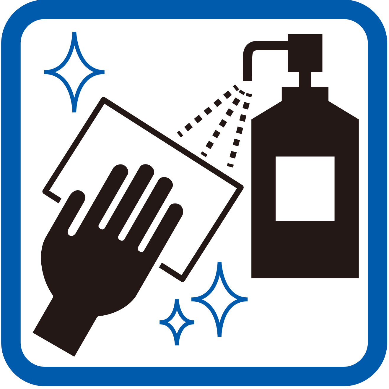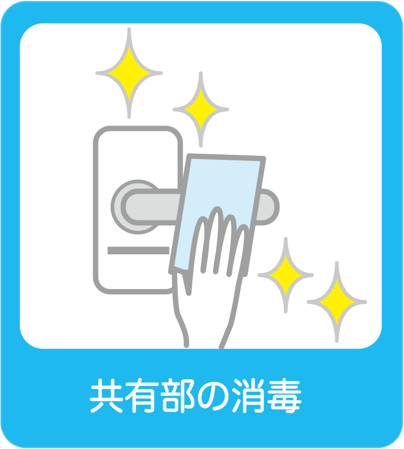 2.手の触れる機会が多い箇所(手すり、ドアノブ、各所ドア全体、電気スイッチなど)は殺菌・消毒効果のある溶剤で適宜拭き上げ